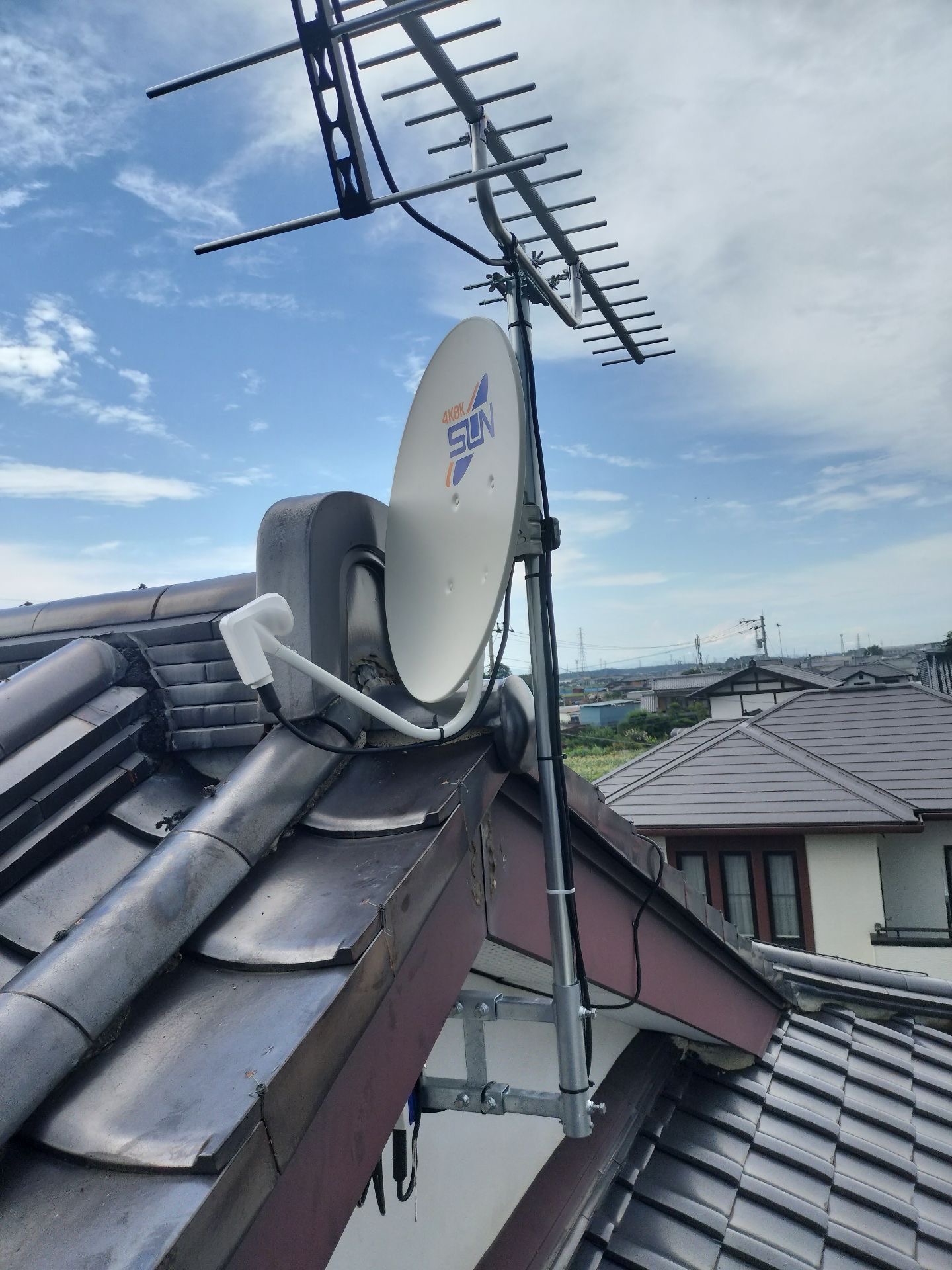下野市にてBSアンテナの追加設置工事を行いました。お客様のご要望で、既存の受信環境に4K8K対応のBSアンテナを追加し、多チャンネル視聴を可能にしました。屋根…